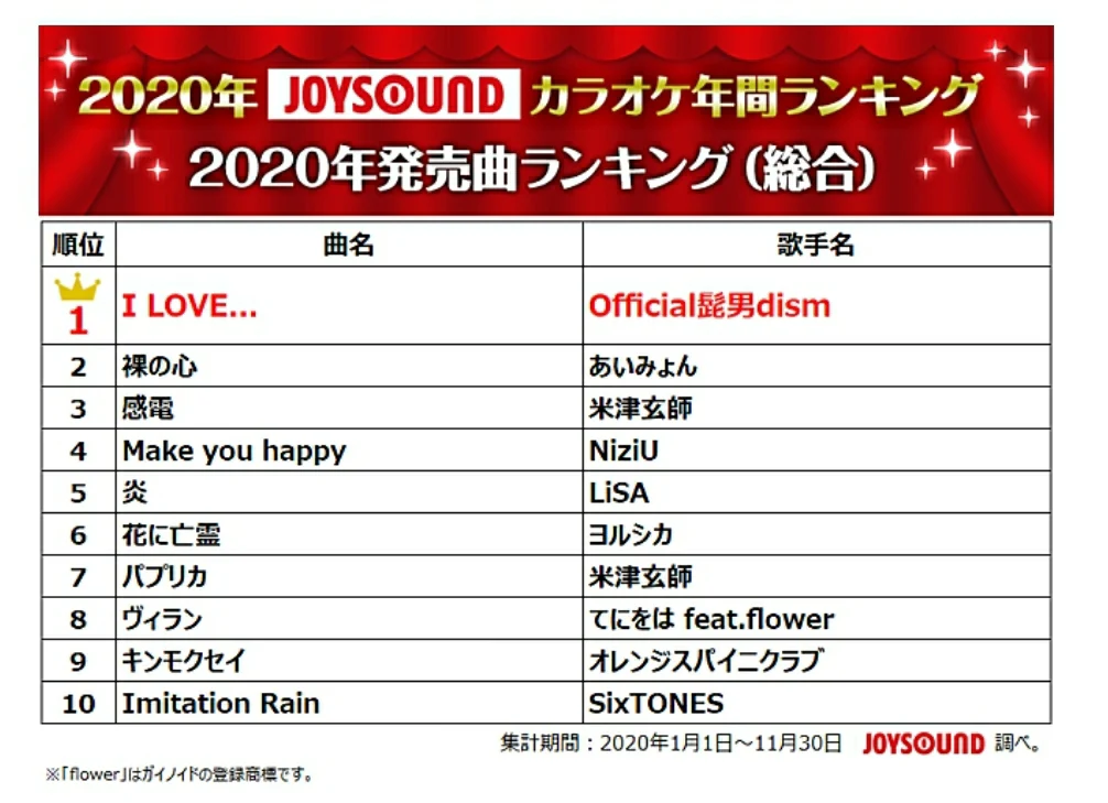 JOYSOUND、2020年カラオケランキングを発表